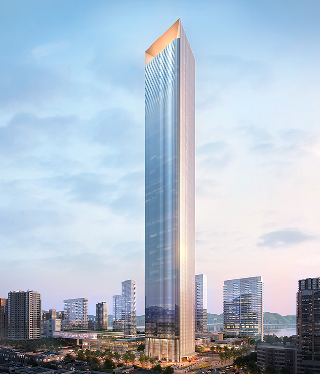 建筑高度:380m(79层) 幕墙面积:13.9万m² 项目设计:SOM建筑事务所/浙江绿城建筑设计有限公司 幕墙类型:单元式玻璃幕墙、编制式单元幕墙等